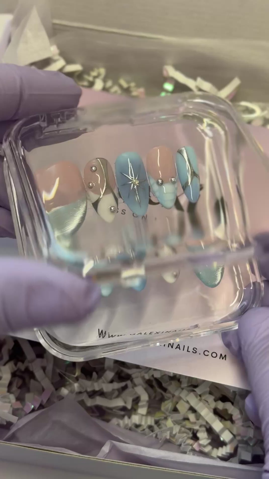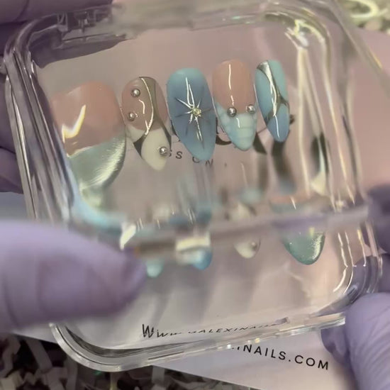 Blue and silver chrome mix n match nails with cat eye details, croc print French tips and silver beads.