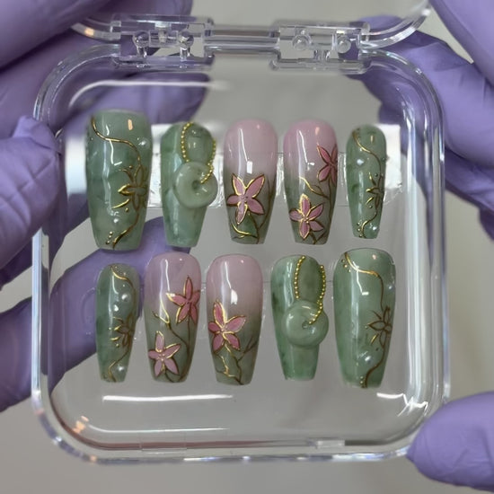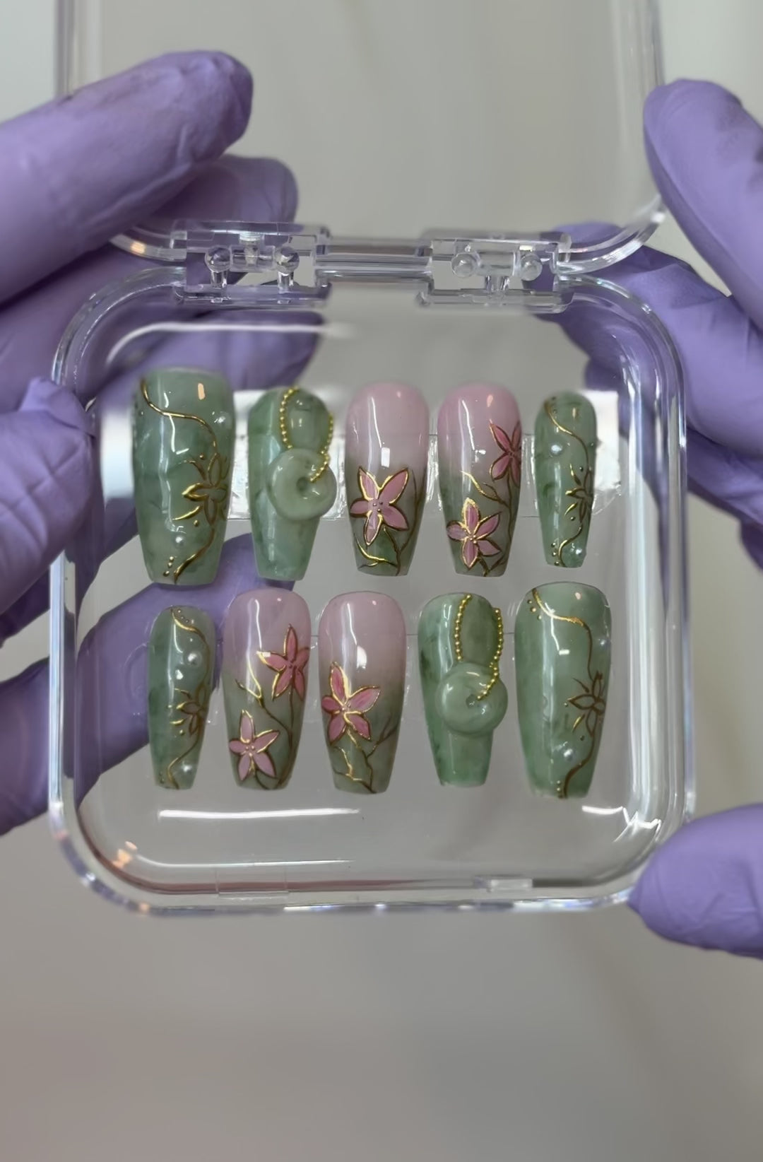 Gold outlined florals over a jade base with jade jewelry and gold accents.