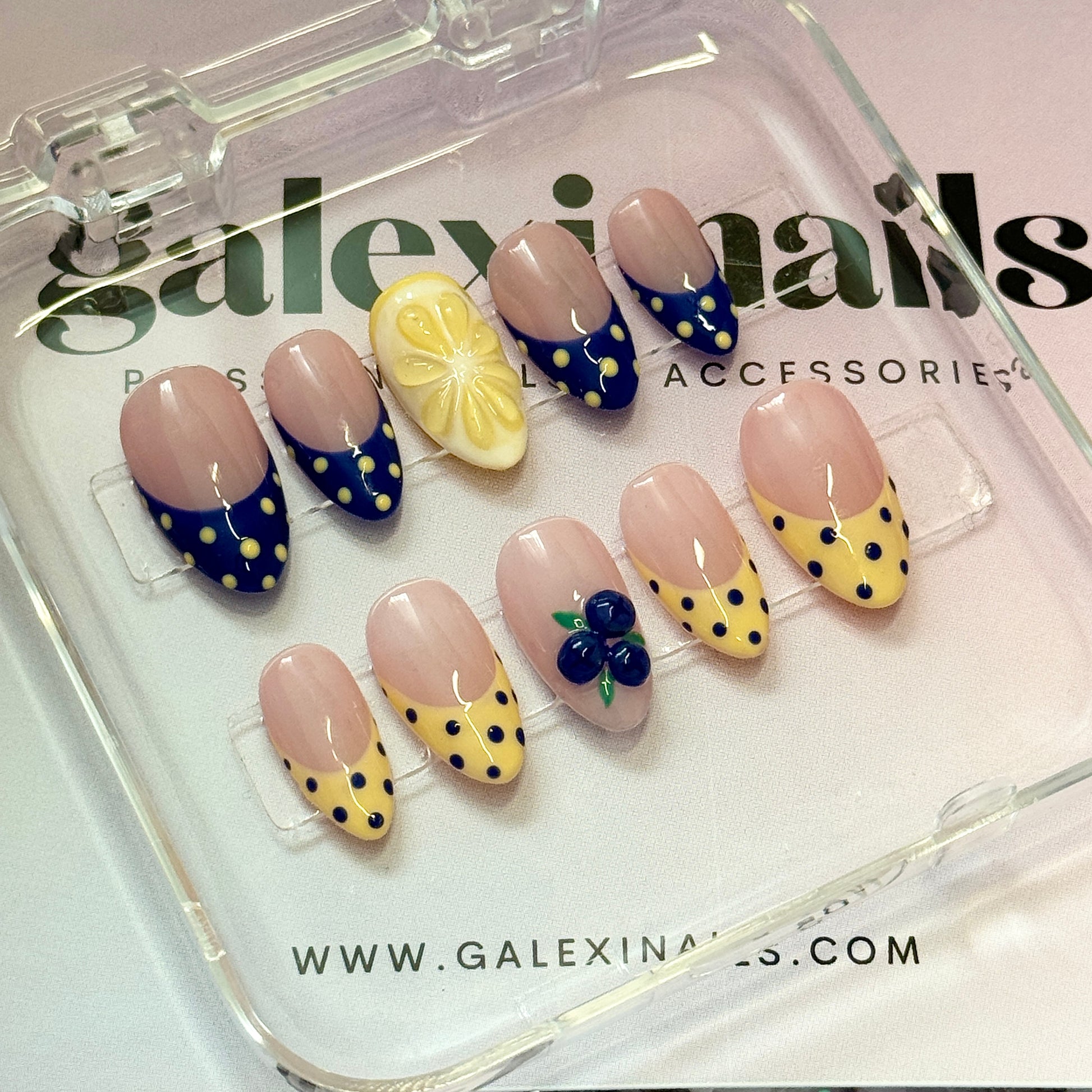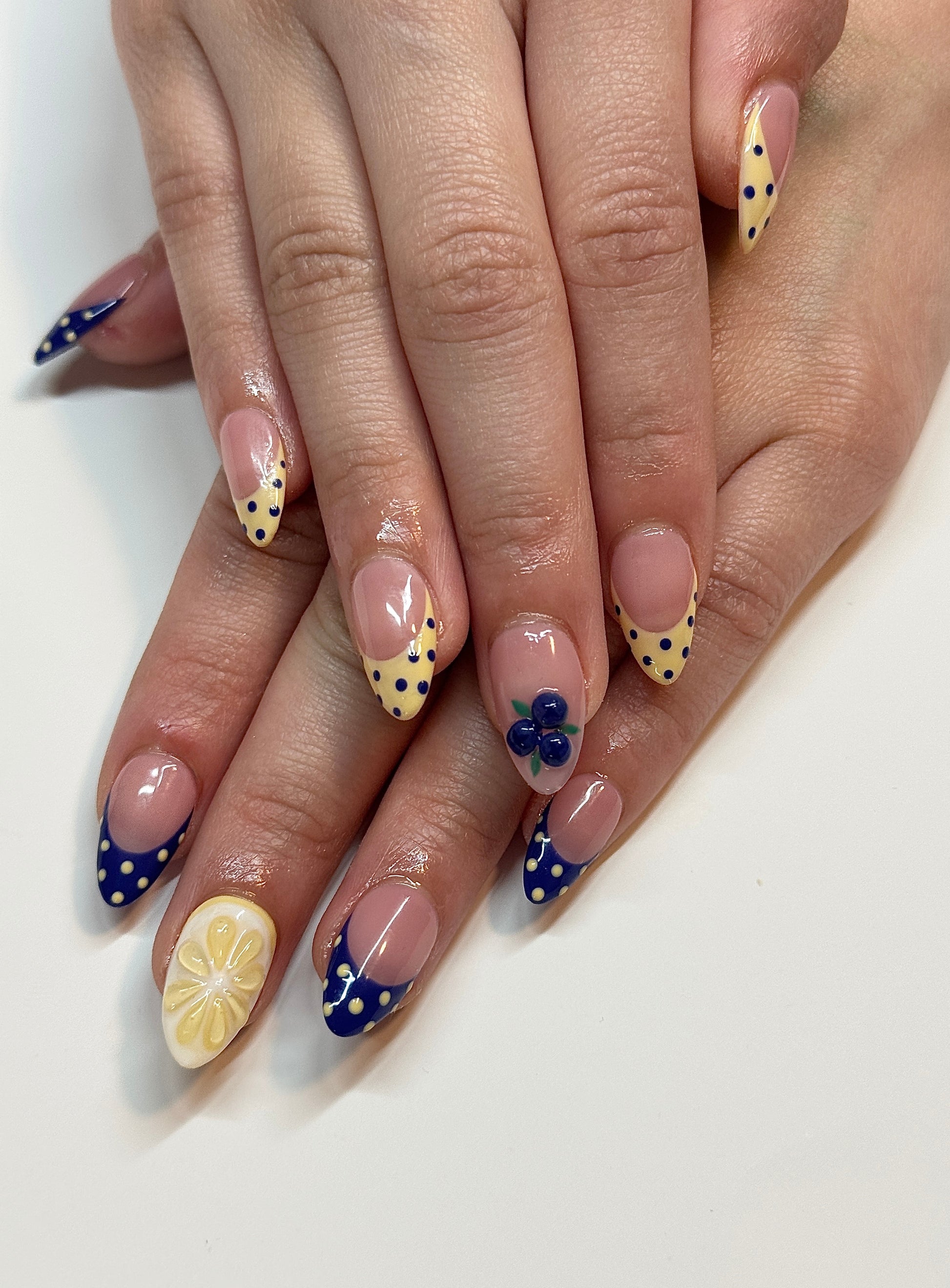 Fun and fruity polka dot nails with a 3D lemon and 3D blueberries