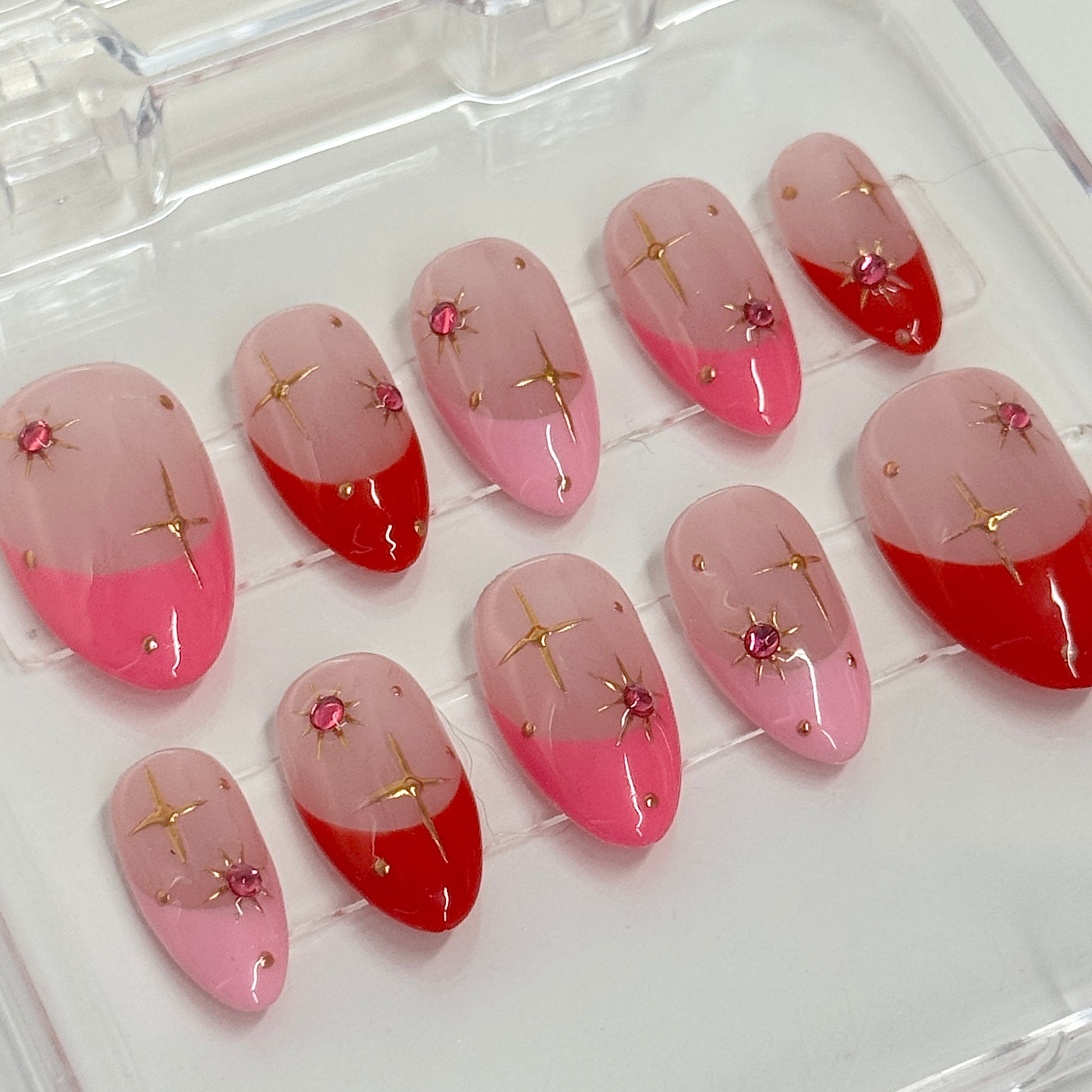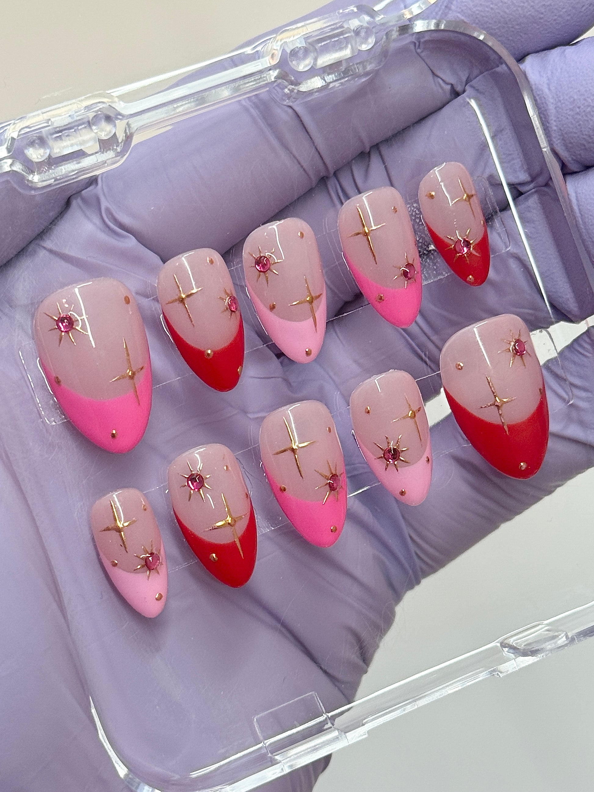 Trendy Valentine's Day design featuring red and pink French tips, gold chrome stars and rhinestones